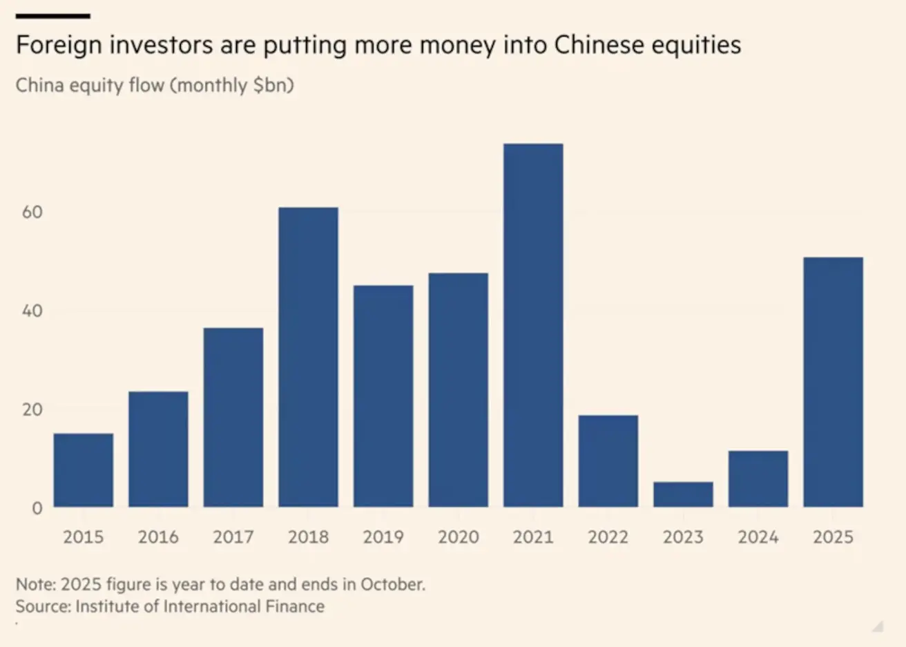 According to the Institute of International Finance (IIF), global investors poured more than $50 billion into the Chinese equity market in 2025 — exceeding the total inflows of the past three years combined.