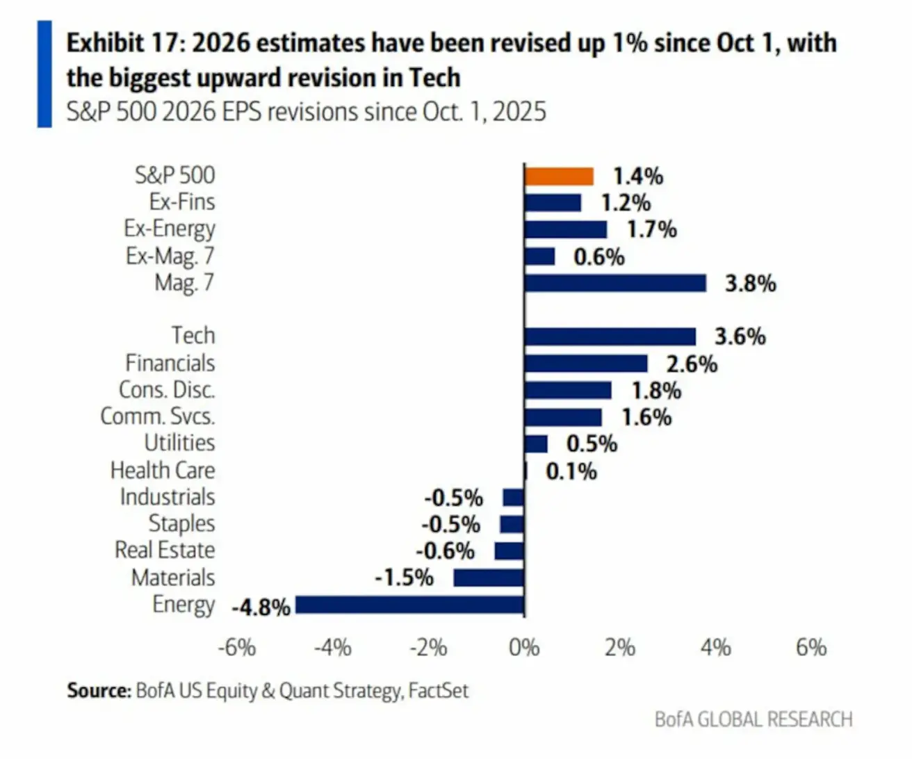 - The most significant upward revisions are concentrated in the technology sector. Key drivers include: strong earnings reports, new AI product cycles, expanding margins, and accelerating cloud and AI-related CapEx.