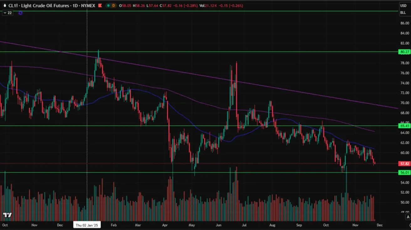 Weekly performance: –3.29% (week closed at $57.98/barrel). Year-to-date: –19.30%.