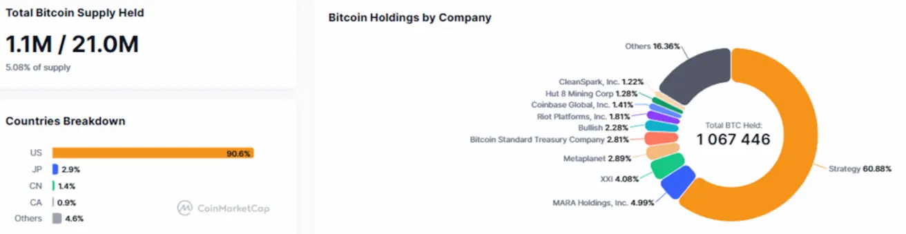 The share of bitcoins held on corporate balance sheets has risen to 5.08% of the total bitcoin supply (vs. 5.04% the previous week).