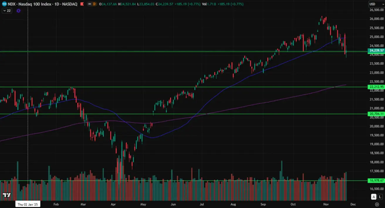 Weekly performance: –3.07% (week closed at 24,239.57). Year-to-date: +14.77%.