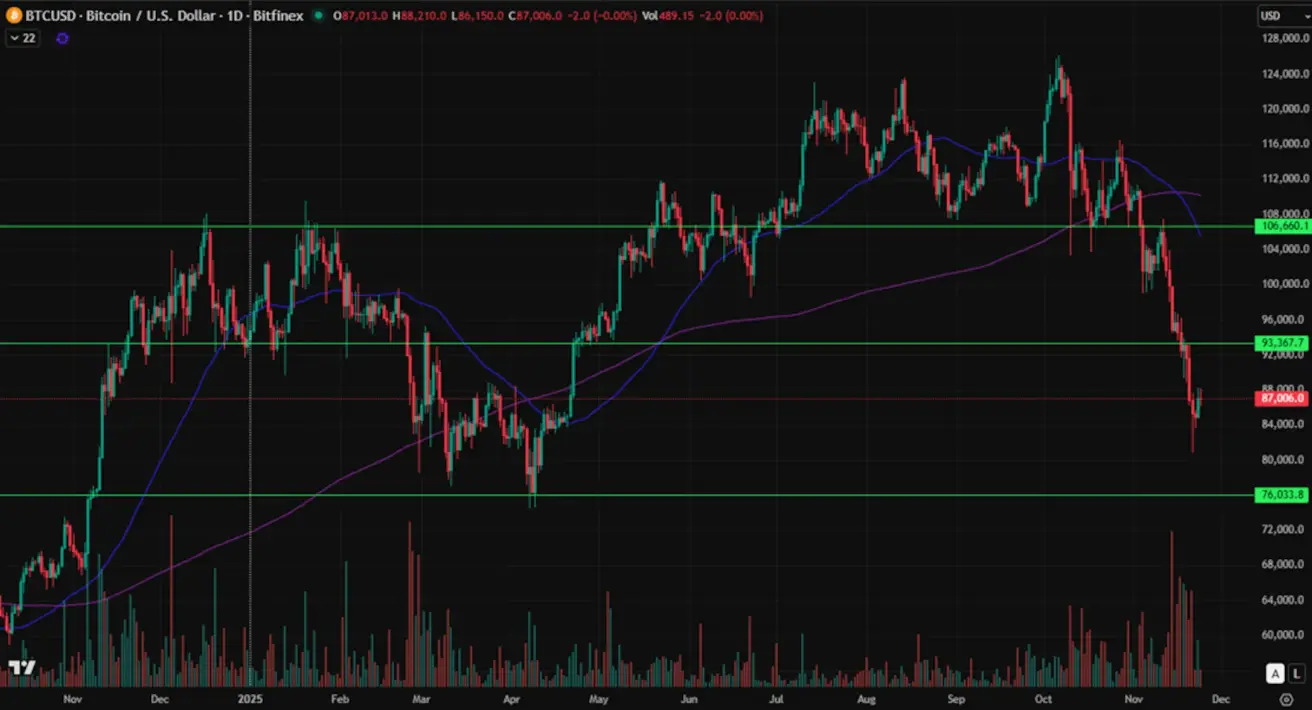 Weekly performance: –8.02% (week closed at $87,008.70). Year-to-date: –7.20%.