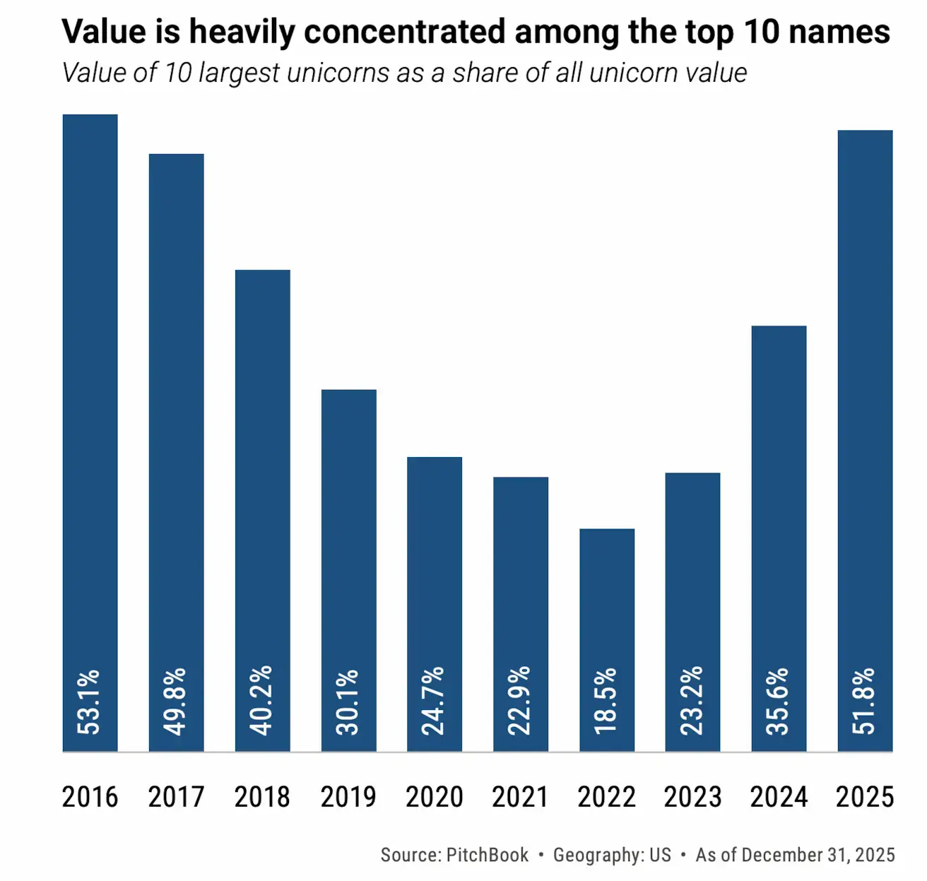Iš vienos pusės, ši tendencija rinkoje pasiskirsto netolygiai: reikšminga vertės dalis sutelkta dešimtyje vertingiausių vienaragių. Rizikos kapitalo industrijoje tokia koncentracija laikoma norma – priešingai nei viešosiose rinkose, kur panašus modelis dažniausiai vertinamas kaip padidėjusios rizikos ar perkaitimo požymis.