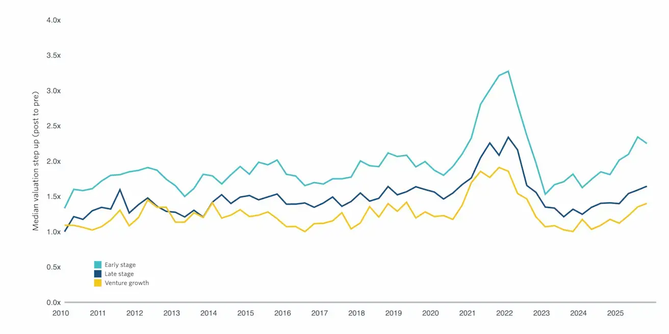 Tarp mažiau akivaizdžių rinkos atsigavimo ženklų – vertinimo šuolių augimas per finansavimo etapus. Visuose pagrindiniuose rizikos kapitalo ciklo etapuose per metus išaugo medianinis šuolis (post-money dabartinio etapo vertinimo iki pre-money kito etapo vertės santykis). Šią dinamiką palaiko du veiksniai: atgimusi investicinė veikla ir antrinės rinkos sandorių suaktyvėjimas.