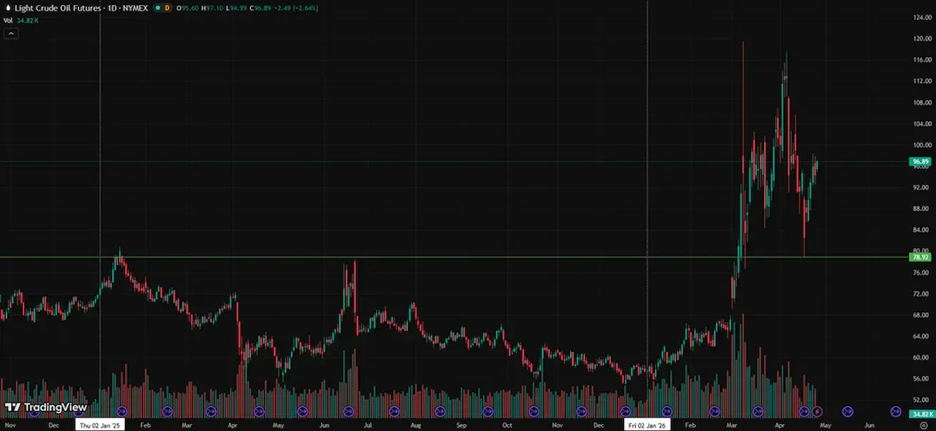 Weekly performance: +14,30% (week-end close: $94,40 per barrel). Year-to-date performance: +64,43%.