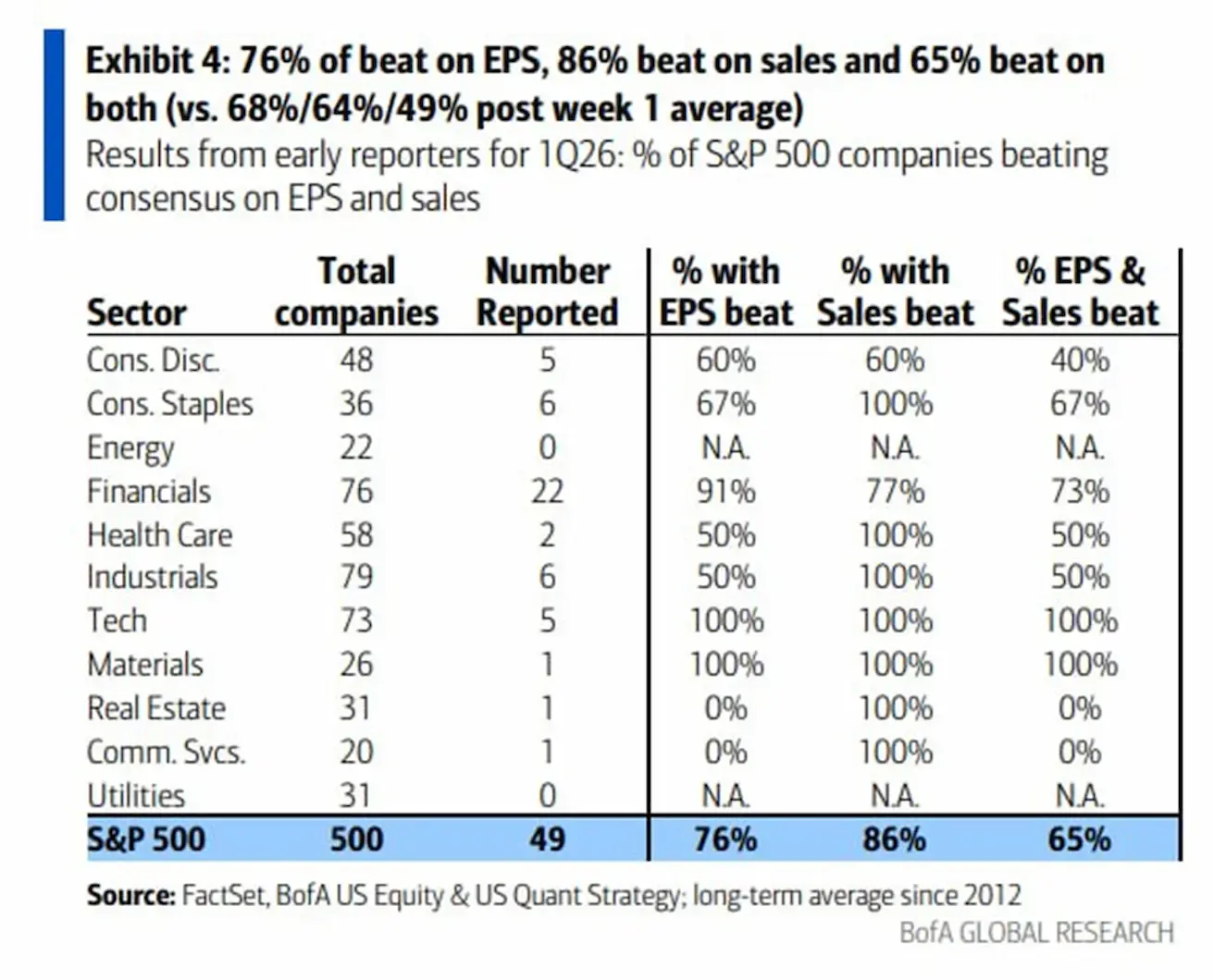 - 76% reported EPS beats;
