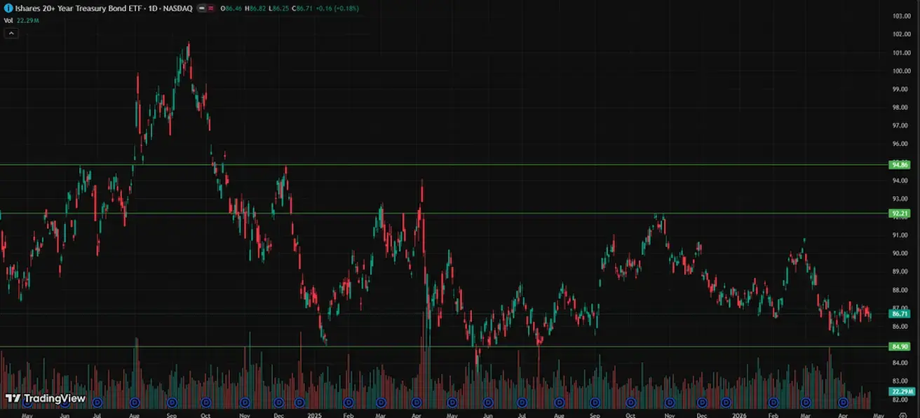 U.S. Treasuries 20+ (ETF TLT): weekly performance: -0,41% (week close: 86,71); year-to-date: -0,52%.