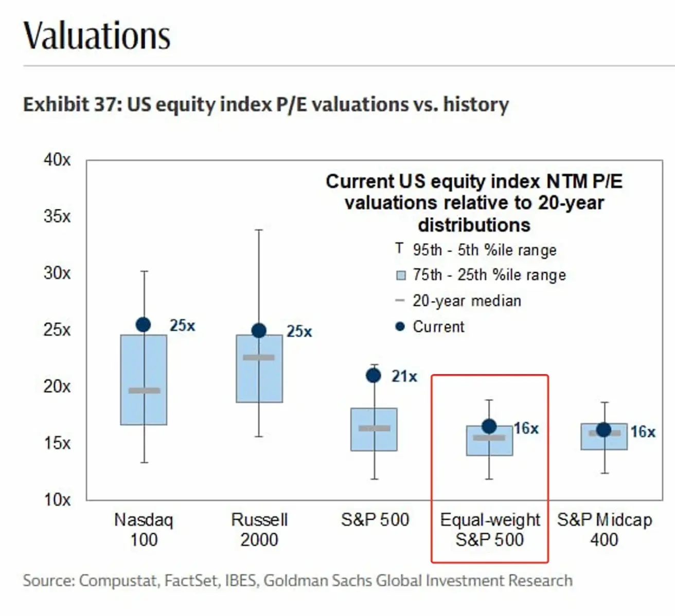 Nasdaq 100 — at 25x, above its median (20x) and closer to the upper bound of the range. The elevated valuation reflects a premium for anticipated growth in the technology sector, particularly driven by AI.