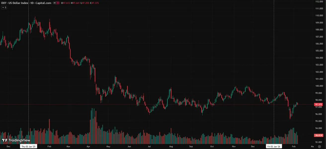 U.S. Dollar Index futures (DX): weekly performance +0.52% (week-end close: 97.373); year-to-date: −0.63%.