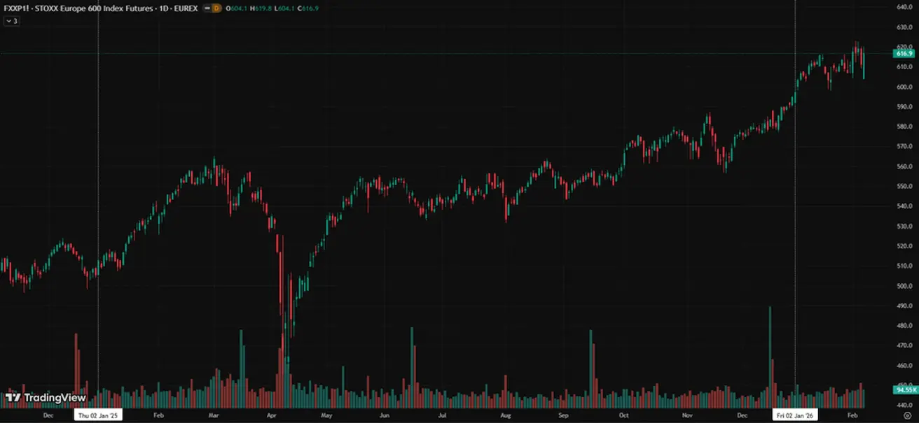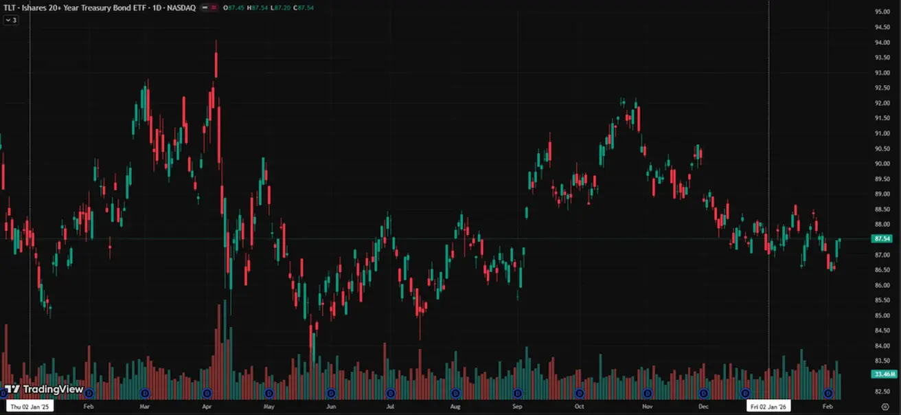 The U.S. bond market does not signal a deep recession or systemic risk. U.S. Treasuries 20+ (ETF TLT): weekly performance +0.47% (week-end close: 87.54); year-to-date: +0.44%.