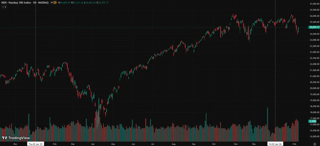 Weekly performance: −1.87% (week-end close at 25075.77); year-to-date: -0,69%.