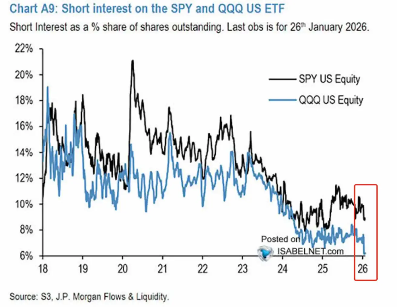 JP Morgan data show a sharp decline in short positions on the Nasdaq 100 (QQQ) and the S&P 500 (SPY) since the beginning of the year. For the Nasdaq 100, short interest has fallen to a historical low (short interest refers to the share of short positions as a percentage of total shares outstanding).