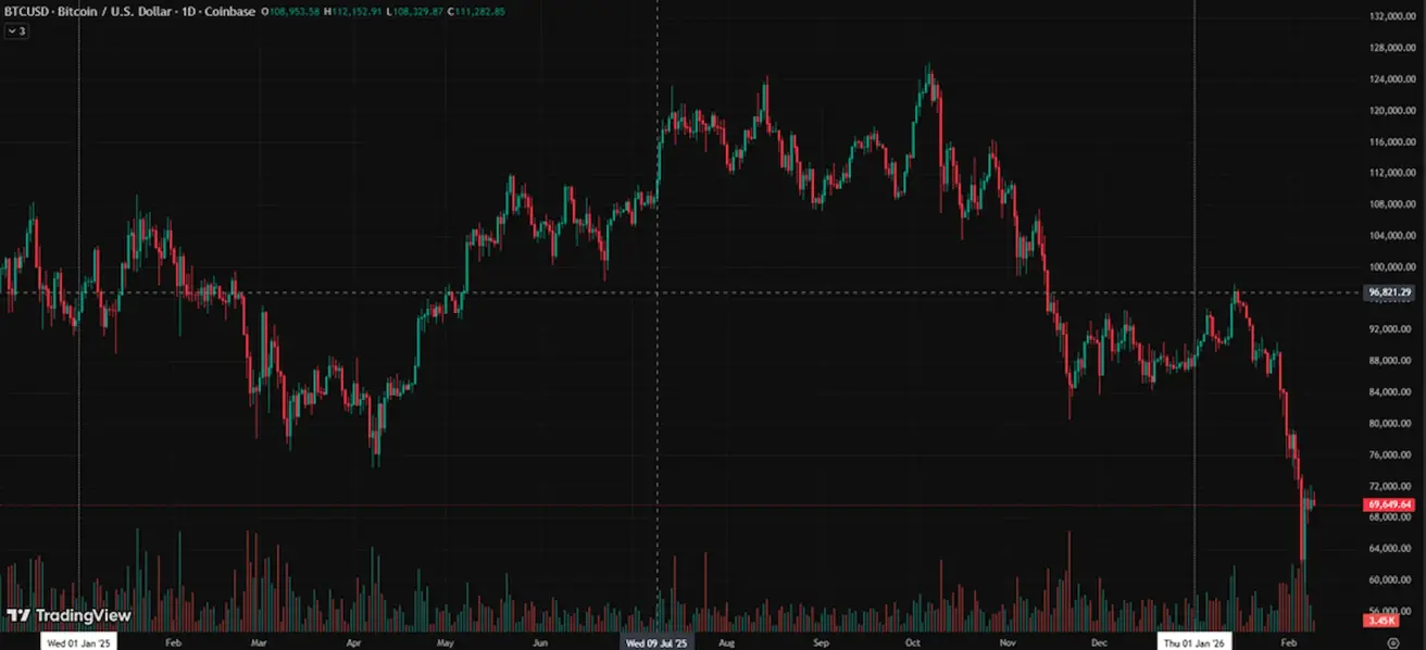 Weekly performance −8.70% (week-end close: USD 70,279.33); year-to-date: −19.88%.