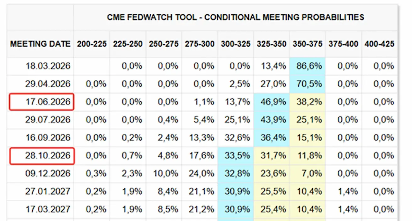 Over the next 12 months, the market is pricing in two 25 bp rate cuts, bringing the policy rate to a range of 3.00%–3.25%. The first cut is expected in June, after three meetings.