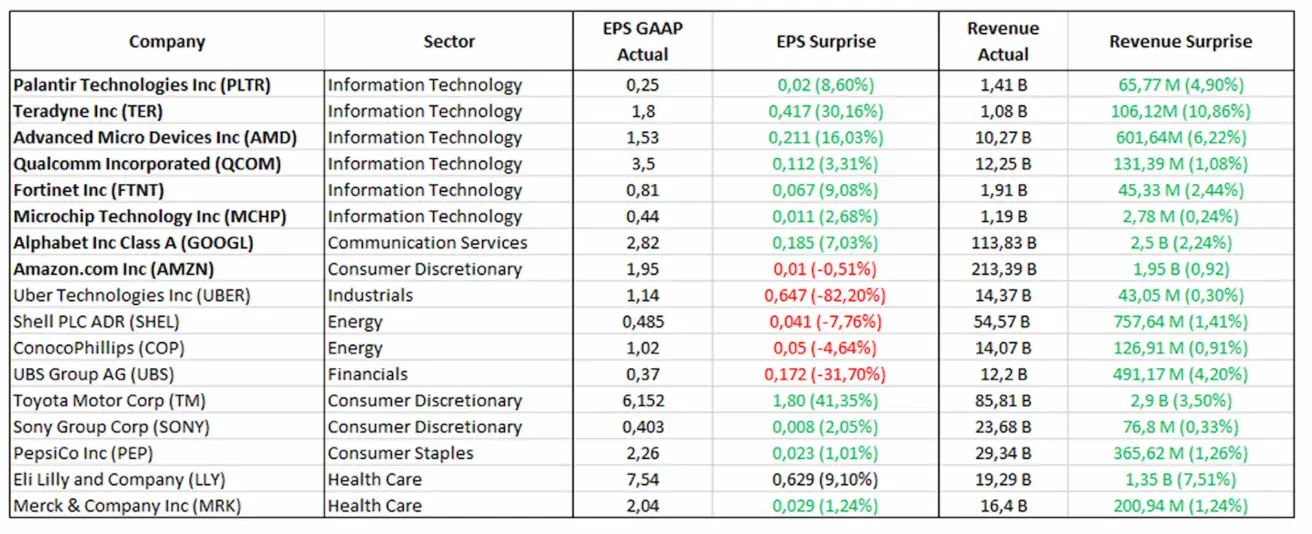 The technology sector remains the primary growth driver. IT and communications companies (PLTR, AMD, QCOM, GOOGL, MSFT) are delivering strong results, reflecting robust demand for digital solutions and sustained investment in AI and infrastructure.