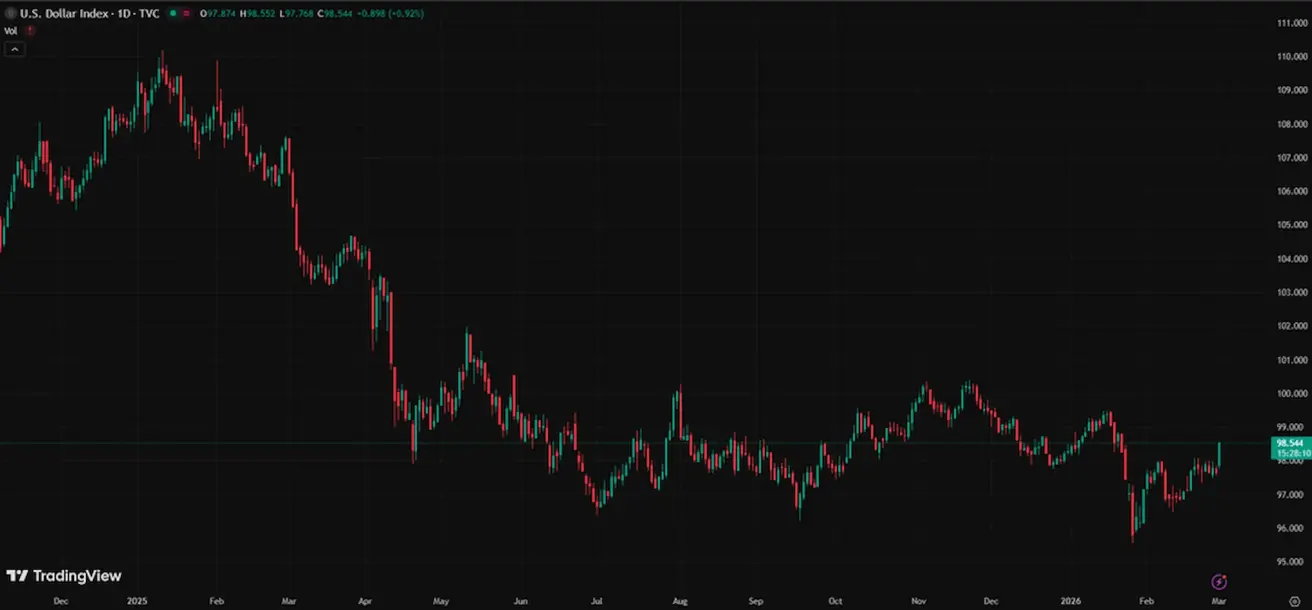Weekly performance: +0.09% (week-end close: 97,646). Year-to-date performance: –0.36%. Today +0,75%. Following its decline at the end of 2025, the dollar is trading in the 96–99 range; expectations of a more neutral Federal Reserve policy are limiting the upside potential but are not creating sustained downward pressure on the USD.