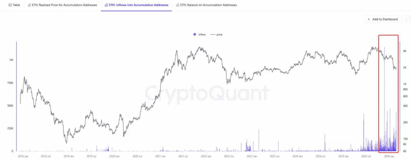 ETH: Inflows into Accumulation Addresses (CryptoQuant) — inflows of Ether into accumulation addresses.