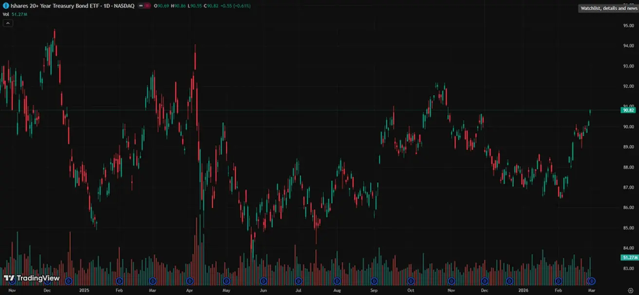 The U.S. debt market does not point to a scenario of a deep recession or systemic risk. U.S. 20+ Year Treasury Bonds (ETF TLT): Weekly performance: +1.58% (week close: 90.82); Year-to-date: +4.20%.