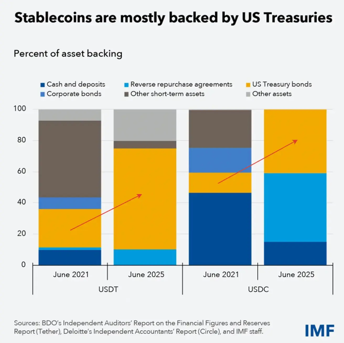 The blue bars represent the volume of ETH flowing into addresses that historically do not spend their coins (accumulation addresses). In the highlighted area (late 2025 – early 2026), a sharp spike in inflows is observed — one of the highest over the entire observation period. This indicates that large holders are accumulating ETH rather than transferring it to exchanges. Coins are being moved into “cold” storage, thereby reducing the liquid supply. The behavior resembles strategic accumulation rather than speculative overheating. Historically, such spikes have often appeared either during the formation phase of a medium-term bottom or at an early stage of a new upward impulse. In 2021, reserves were more “diversified.” By 2025, USDT and USDC had become almost fully backed by U.S. Treasuries and repo agreements. The share of corporate bonds and other assets has been sharply reduced. This means that stablecoins have effectively become quasi–money market funds. Their growth equals increased demand for T-bills. The crypto ecosystem is becoming increasingly interconnected with the U.S. short-term government debt market.