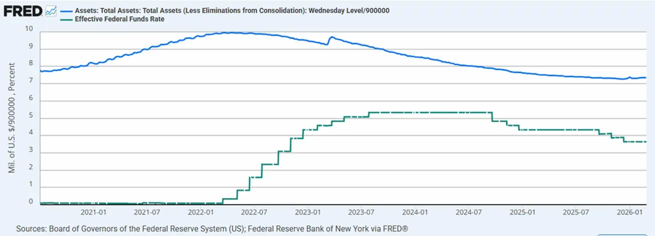 - Federal Reserve Balance Sheet: $6.613T, up 1.19% since the suspension of quantitative tightening (QT) ($6.535 trillion).