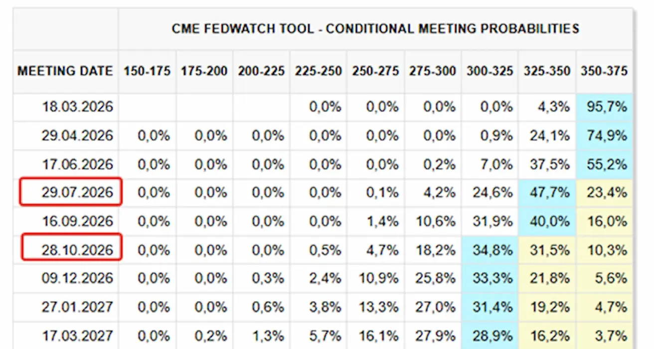 Over the next 12 months: two 0.25% rate cuts to a range of 3.00–3.25%. The first step is expected at the July meeting: