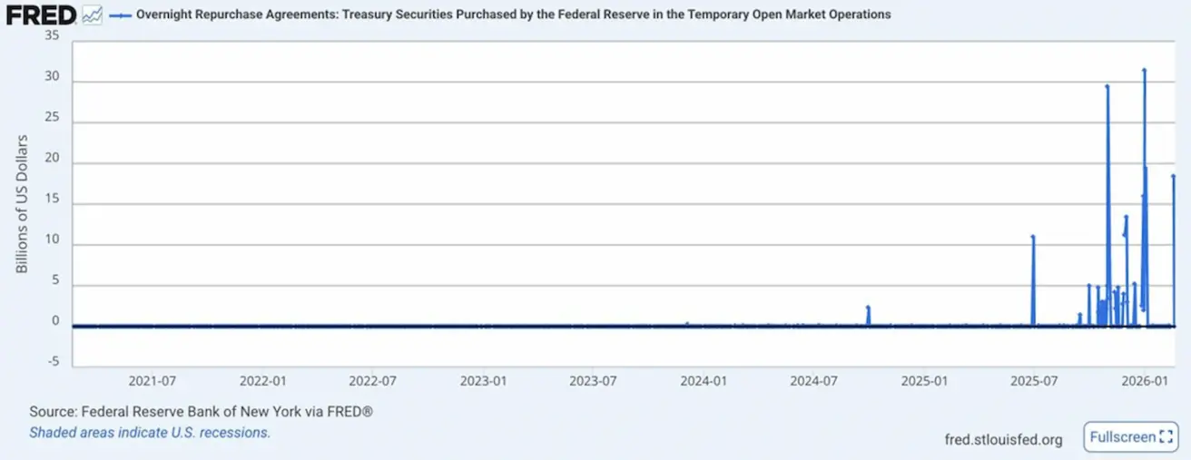 FRED: Overnight Repurchase Agreements (Temporary Open Market Operations) — the Federal Reserve’s purchases of Treasury securities through repo operations: