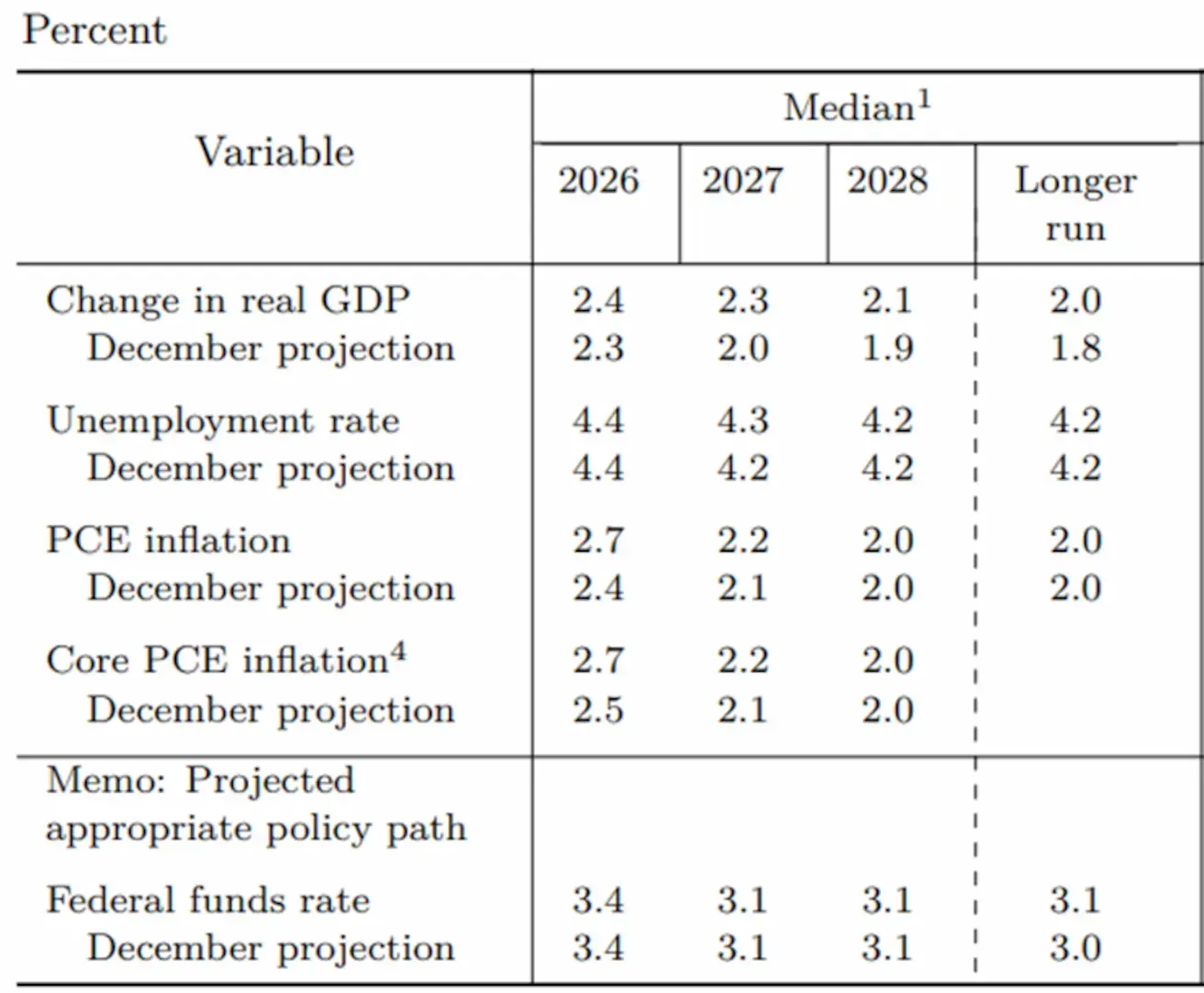 The Committee upgraded its 2026 GDP growth forecast to 2.4% and raised its inflation expectations to 2.7% for both the PCE and Core PCE indices. The interest rate forecast (EFFR) remains unchanged: one 0.25% cut in 2026 to a range of 3.25–3.50%, and one cut in 2027 to 3.00–3.25%, with this range maintained over the long-term horizon.