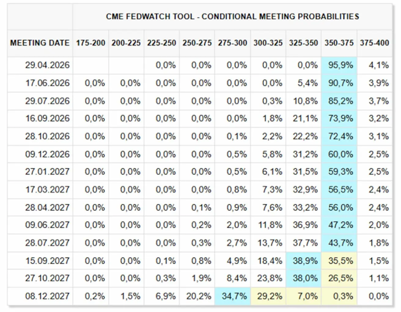 Market rate expectations for the April meeting: 4.1% hike; 0% cut. The market no longer prices in any rate cuts by the end of 2026 (compared to two projected cuts at the beginning of the year).