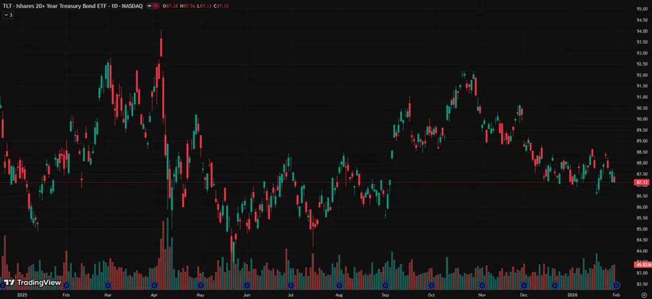 20+ Year U.S. Treasury Bonds (TLT ETF): weekly performance: −0.91% (week-end close: 87.13); January performance: −0.03%.