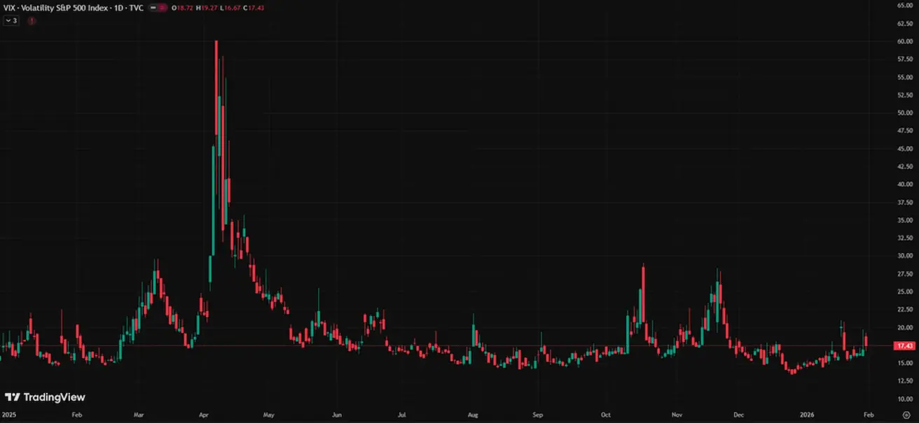 Market expectations reflected in interest rate swaps (FedWatch) remain unchanged and are aligned with the Fed’s December projections: two rate cuts to a target range of 3.00–3.25%. The market expects the first cut to occur after three meetings, in June.
