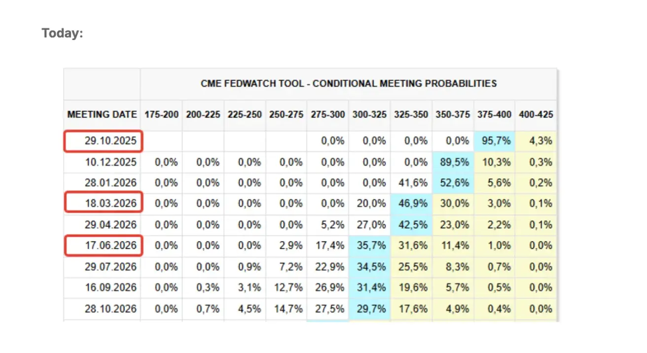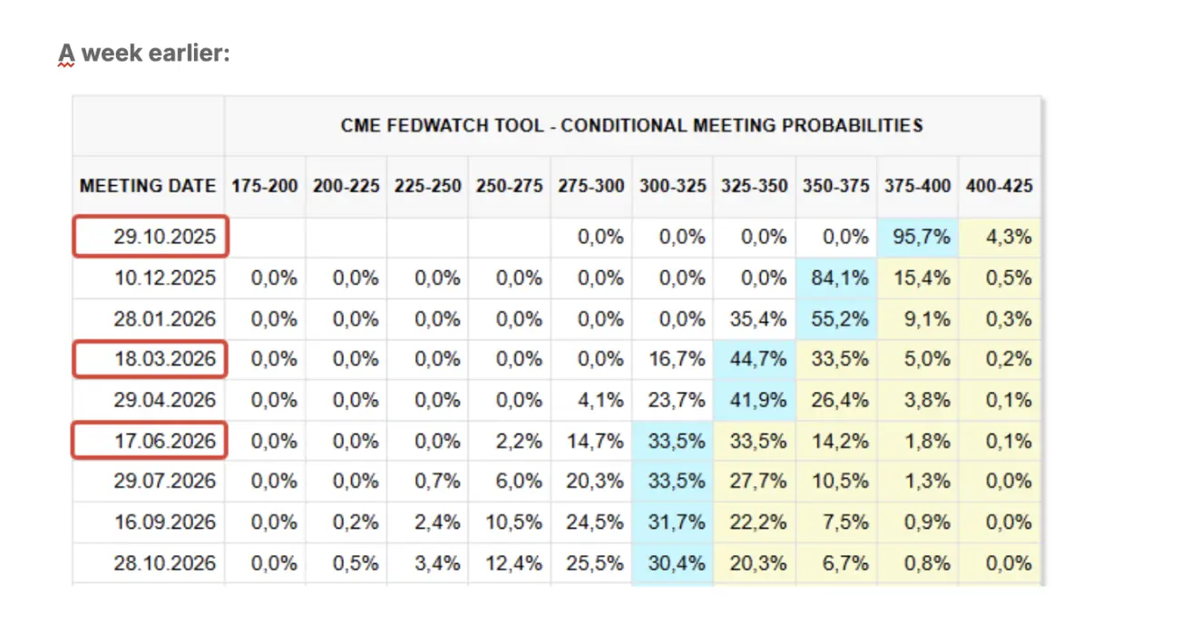 • Next FOMC meeting (29 October): the implied probability of a 0,25 bps rate cut is 95.7%, indicating one reduction by year-end.
