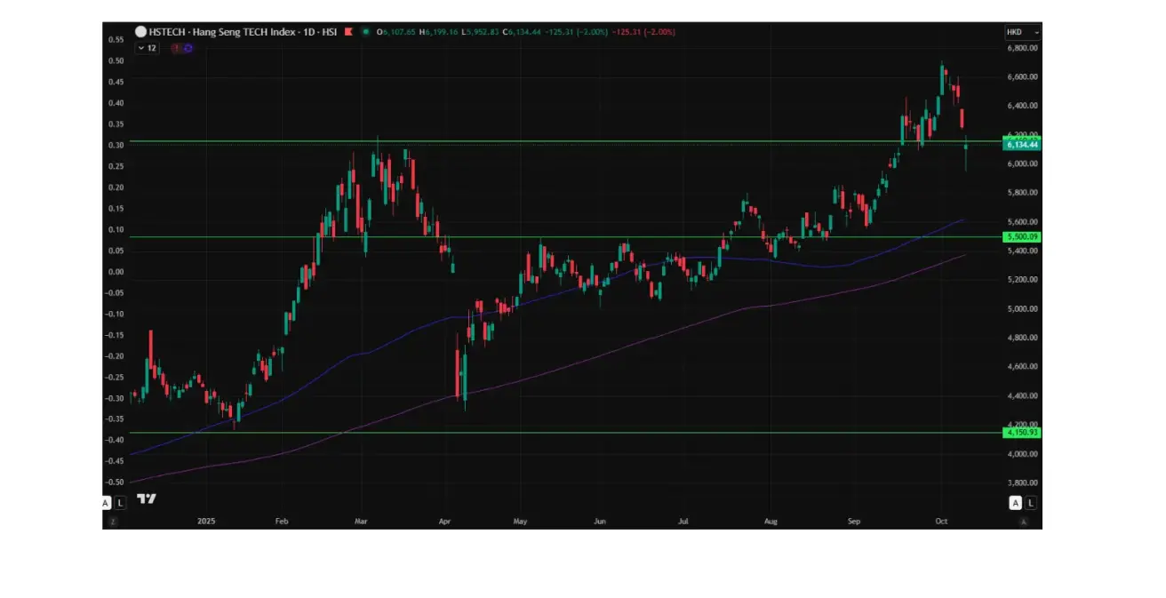 The Hang Seng TECH Index (HSTECH.HK) opened Monday down 5.48%, at 6259,75. Year to date, the index has advanced +41.09%.