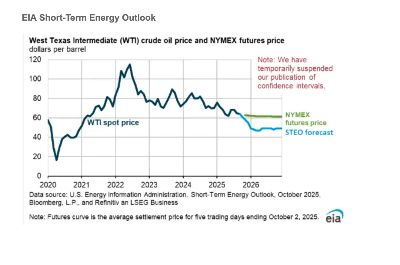 We expect global oil inventories to continue building through the end of 2026, which will put significant downward pressure on crude prices in the coming months. We forecast Brent crude to average $62 per barrel in Q4 2025 and $52 per barrel in 2026.