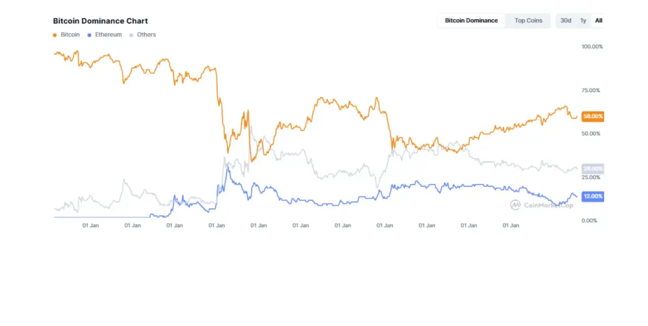 • Bitcoin’s share is 58.5% (vs. 58.4%),
