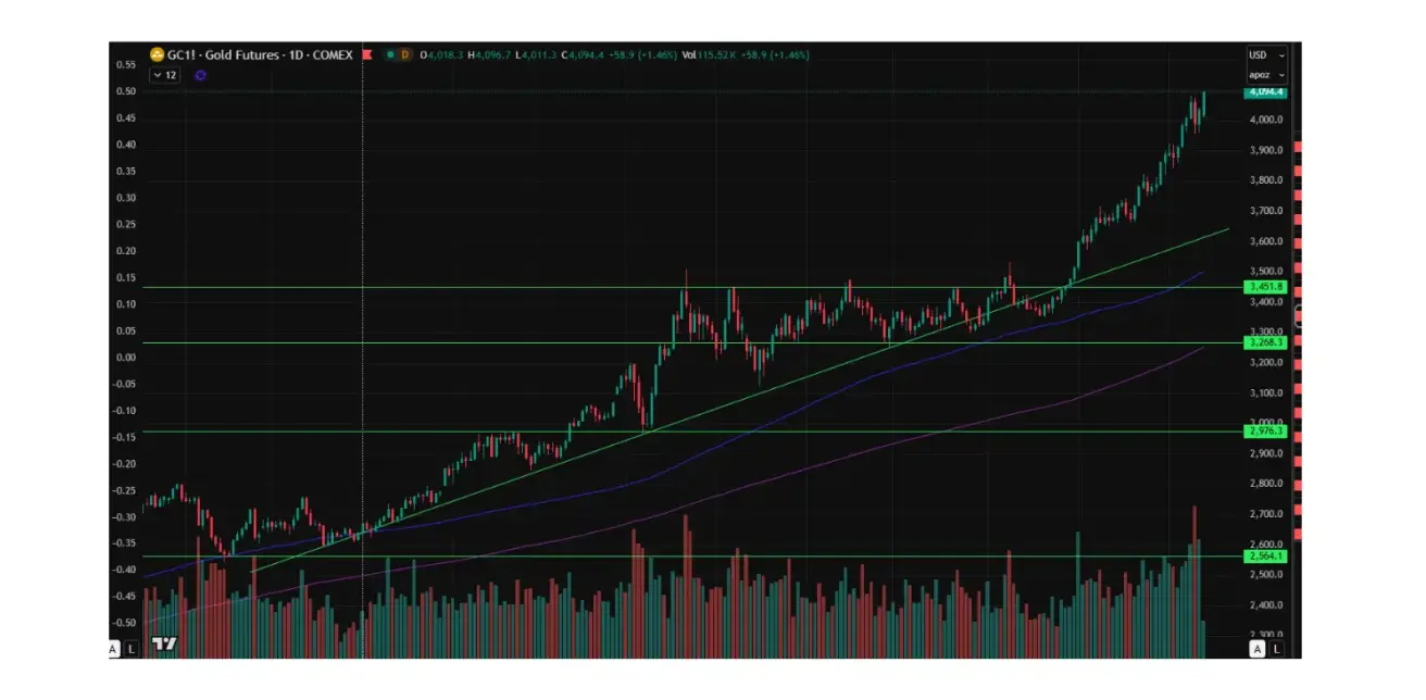 The gold futures (GC) contract ended the week up 3.15%, closing at $4035,5 per troy ounce. Year to date, it has gained +52.80%.