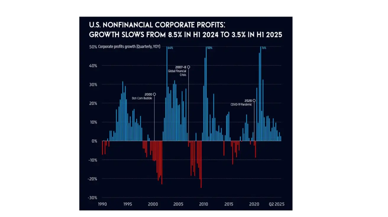 Earnings season for Q3 kicks off on Tuesday. Profit growth among U.S. non-financial corporations is expected to slow — from 8.5% in the first half of 2024 to just 3.5% in the first half of 2025.