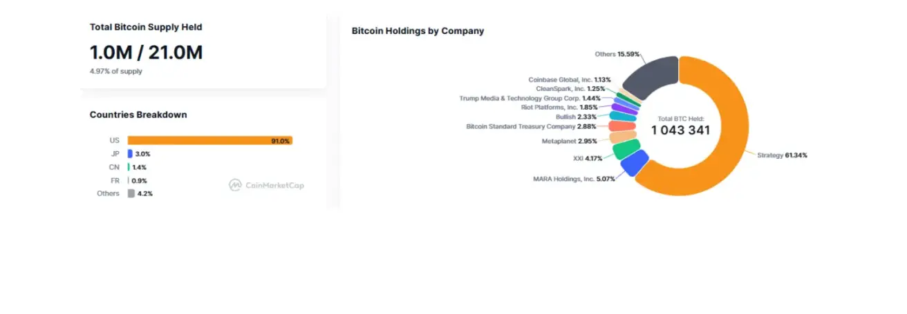 Public companies with a Bitcoin treasury strategy hold 4.97% of the total Bitcoin supply (vs. 4.92% a week earlier) — the share remained unchanged from the prior week’s level.