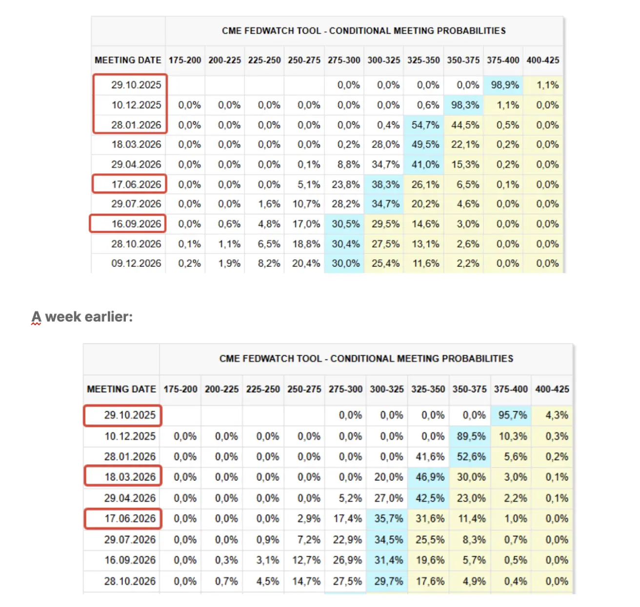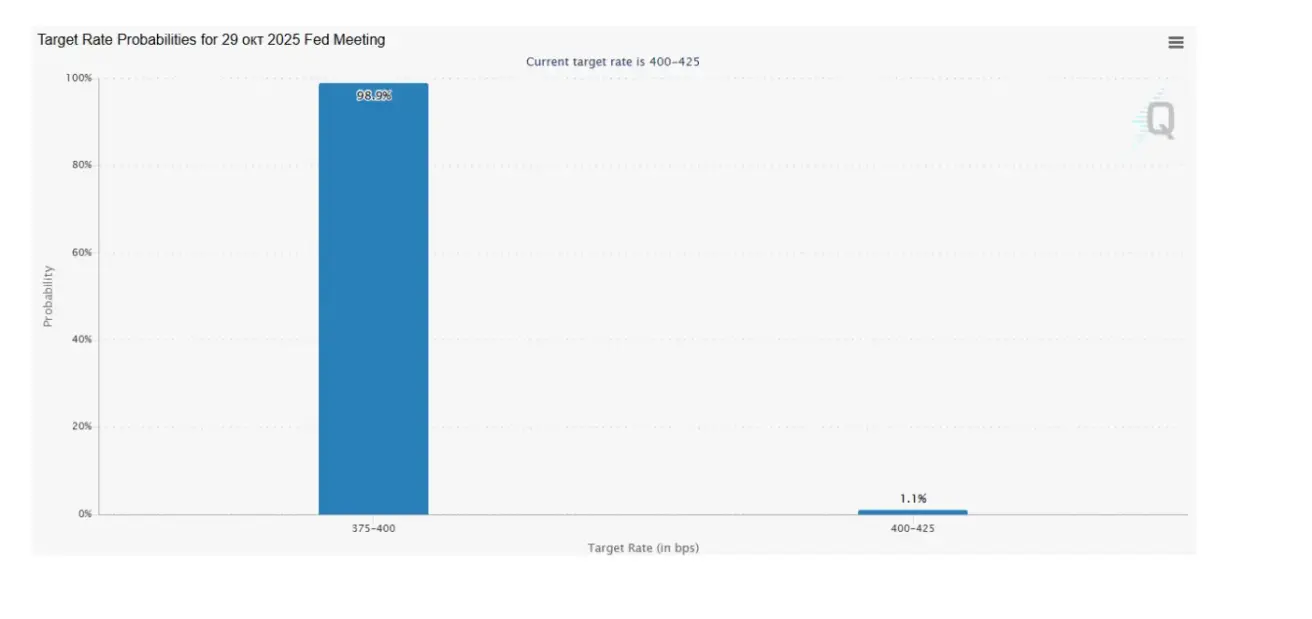 Next FOMC meeting (October 29): Markets are pricing in a 98.9% probability of a 25 bps cut — implying only one rate cut for the remainder of the year.