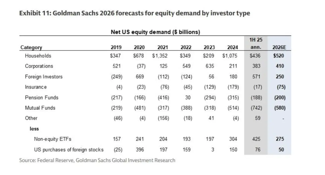 Goldman Sachs expects that households will become the largest buyers of U.S. equities next year, with net purchases totaling $520 billion. Corporate demand, primarily through share buybacks, is projected to rise to $410 billion. Foreign investor inflows are expected to remain positive but nearly halve to $250 billion. Meanwhile, pension funds, insurance companies, and mutual funds are anticipated to continue net outflows from the U.S. equity market.