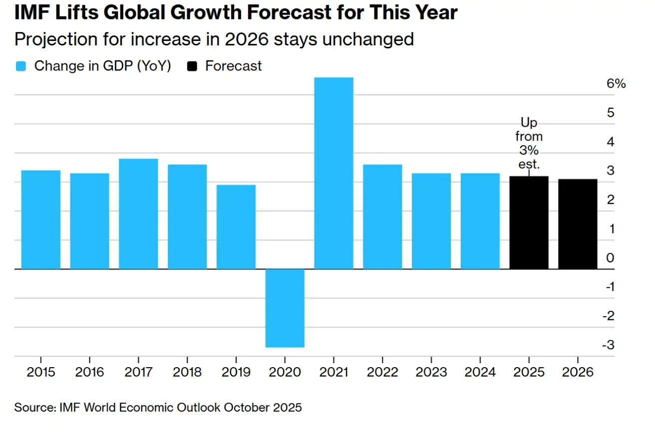 Global growth is now expected at 3.2% in 2025, up from the 3.0% forecast in July, while growth is projected to slow to 3.1% in 2026.