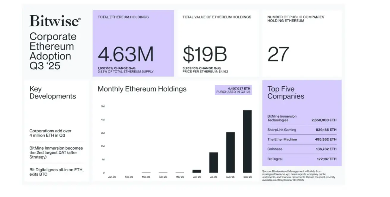 During Q3 2025, public companies added 4.63 million ETH to their treasuries. A total of 27 companies now hold Ethereum with a combined value of approximately $19 billion.