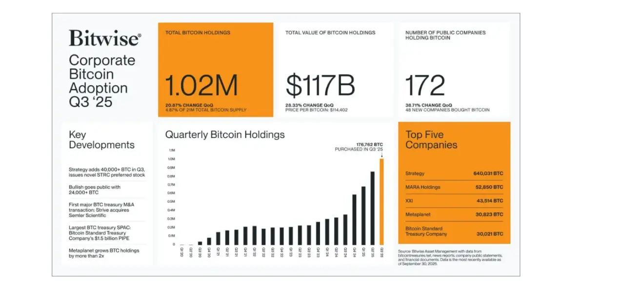 In Q3 2025, the number of public companies holding Bitcoin increased by 38.7%, reaching 172 companies by the end of the quarter. These companies collectively hold 1.02 million BTC, valued at approximately $117 billion