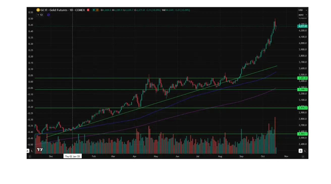 The gold futures (GC) contract ended the week up +5,76%, closing at $4267,9 per troy ounce. Year to date, it has gained +61,60%.