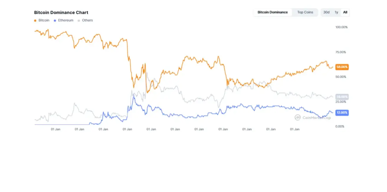 - Bitcoin’s share is 58.8% (vs. 58.5%),