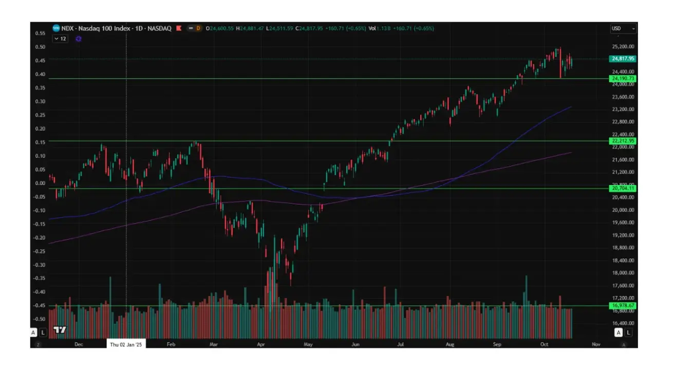 The Nasdaq 100 ended the week up +2,46%, closing at 24817,95. Year to date, the index is up +17,51%.