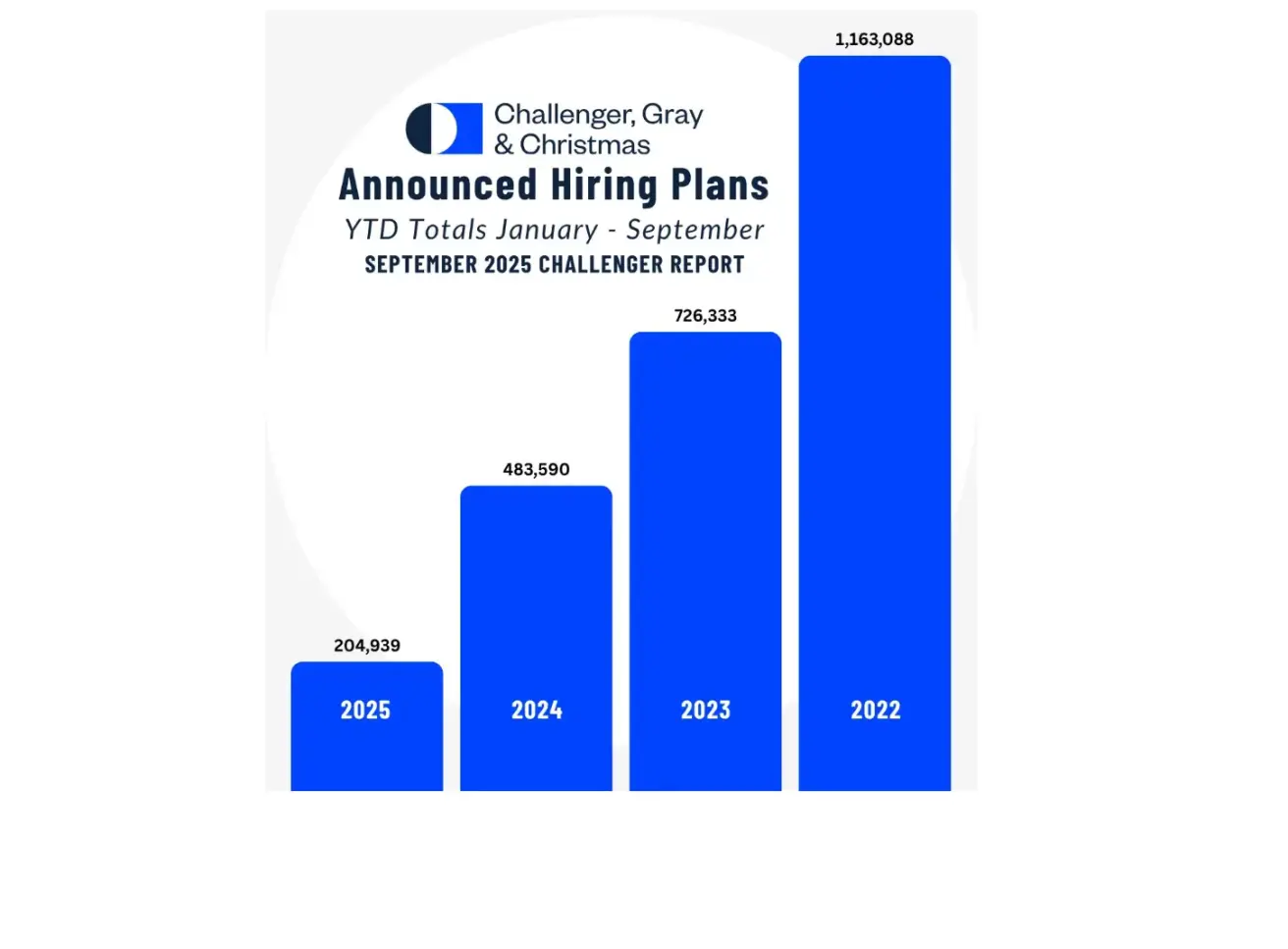 Preliminary labor market indicators are weakening. According to Challenger, Gray & Christmas, a consultancy that assists laid-off workers in job placement and has offices nationwide: U.S. employers have announced plans to hire 205,000 workers this year — 58% less than in 2024, marking the lowest year-to-date hiring announcement figure since 2009.