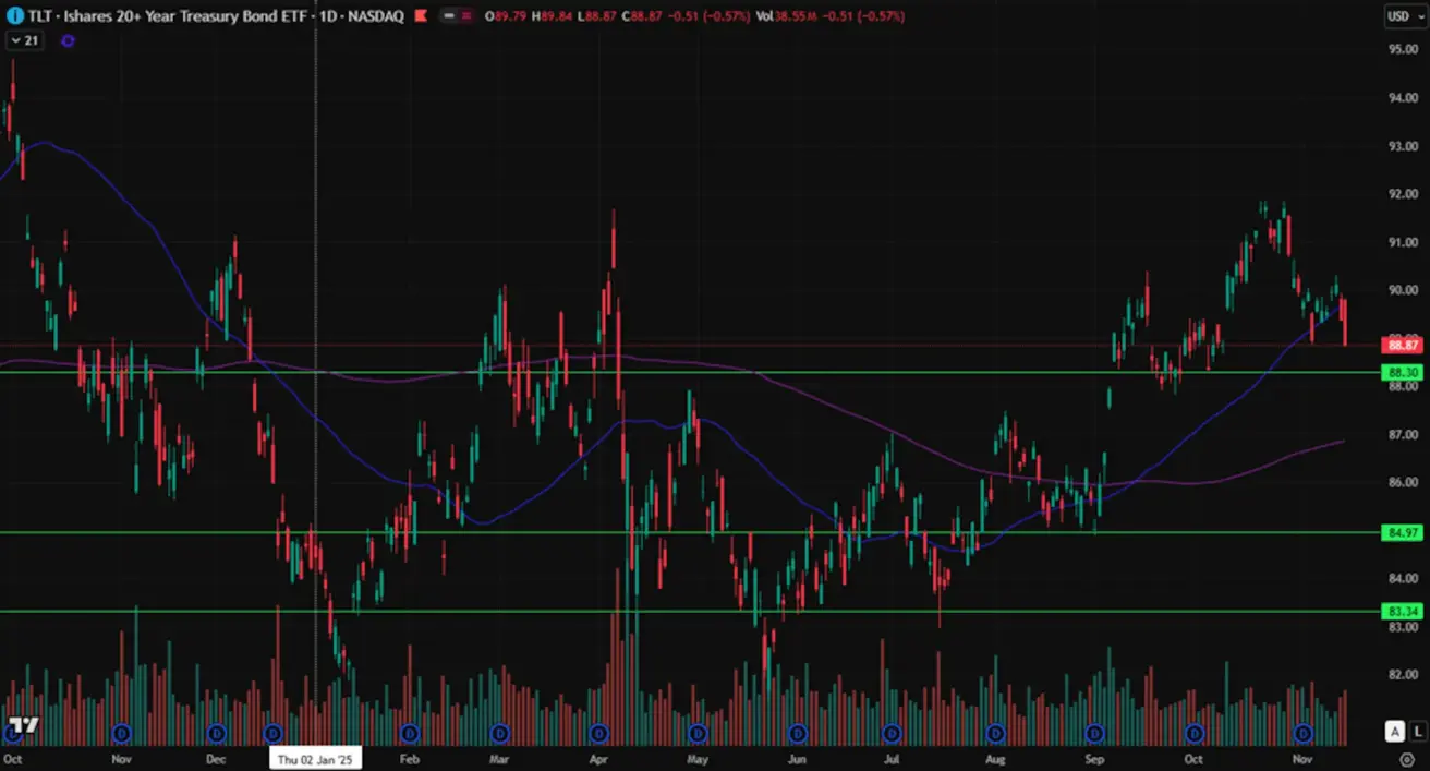 Treasury Bonds 20+ (ETF TLT): weekly performance: -0.87% (week closed at 88.87). Year-to-date performance: +1.22%.