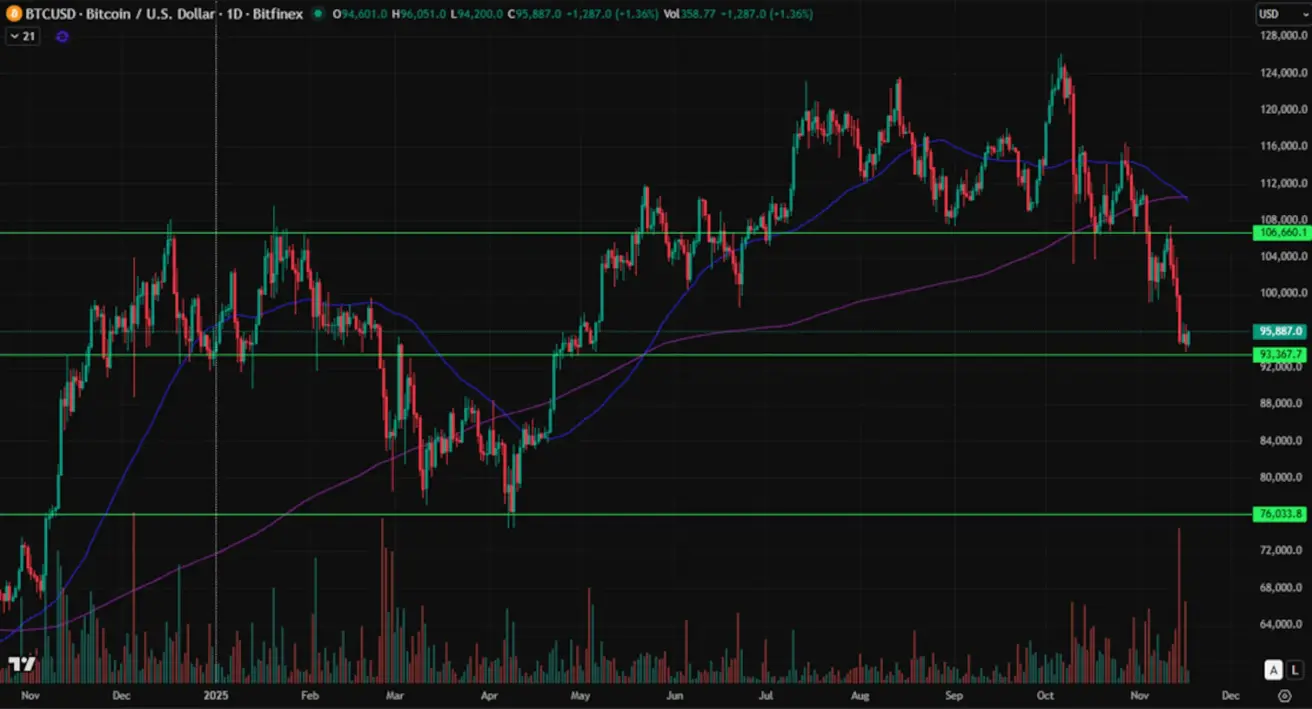 Weekly performance: -9.72% (week closed at $94,600). Year-to-date performance: +0.90%.