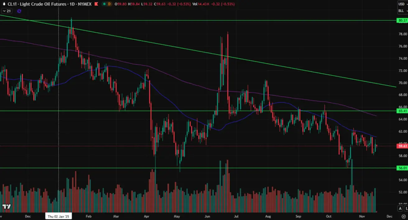 Weekly performance: +0.18% (week closed at $59.95 per barrel). Year-to-date performance: -16.56%.