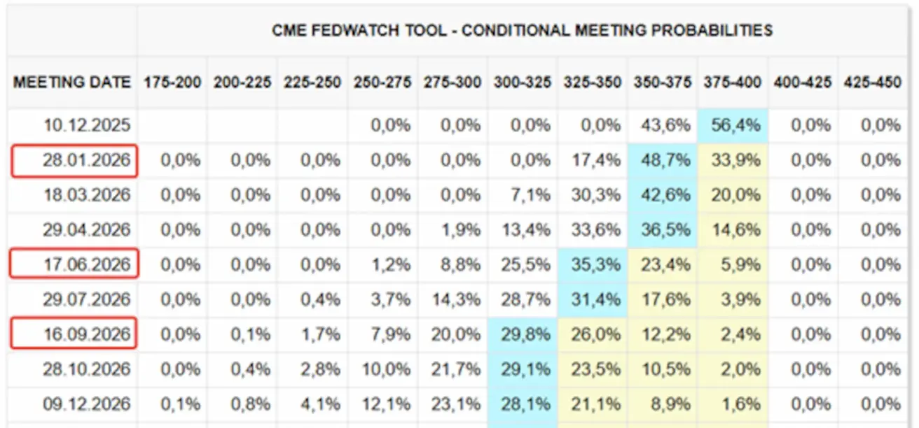 - Over the next 12 months: the market is pricing in three 25 bps cuts, bringing the target range to 3.00 – 3.25%.
